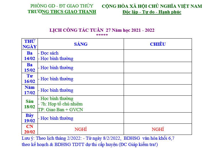 Lịch công tác tuần 23 năm học 2021-2022